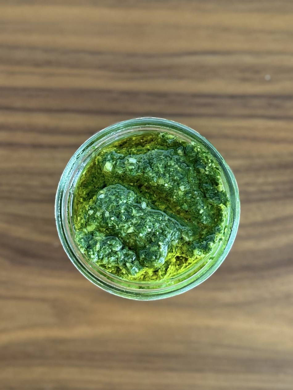 Servir sur des pâtes, au choix, en détendant le pesto avec un peu d’eau de cuisson.